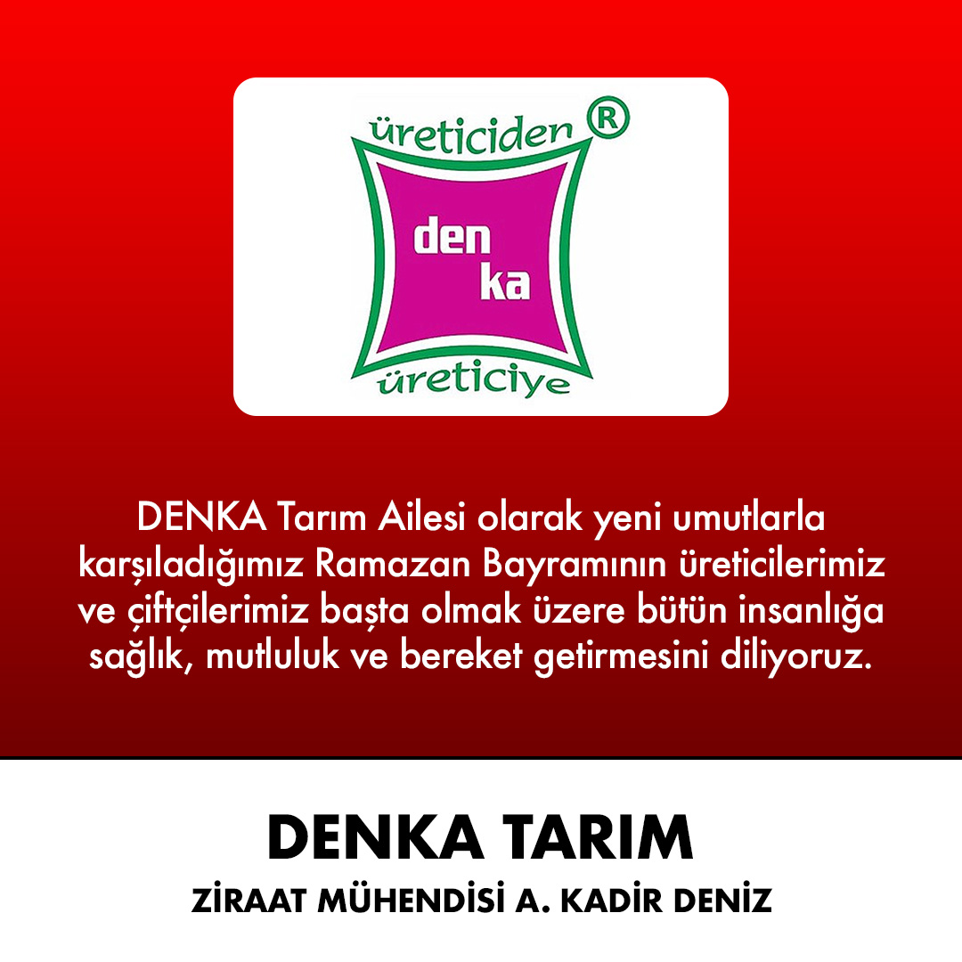 Ziraat Mühendisi A. Kadir Deniz, Ramazan Bayramı için, mesajında şunları kaydetti:DENKA Tarım Ailesi olarak yeni umutlarla karşıladığımız Ramazan Bayramının üreticilerimiz ve çiftçilerimiz başta olmak üzere bütün insanlığa sağlık, mutluluk ve bereket getirmesini diliyoruz.DENKA Tarım İletişimSağlık Mah. Halide Edip Adıvar Cad. No: 55, 0324 814 73 93