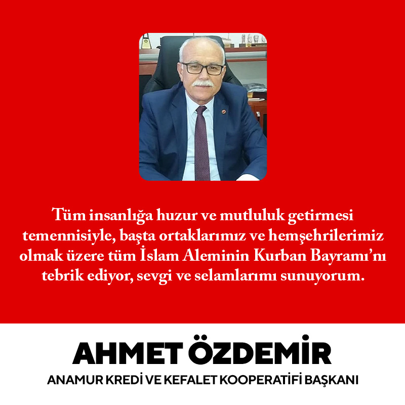 ANAMUR GAZETESİ / Musa Suğan - Anamur Esnaf ve Sanatkarlar Kredi ve Kefalet Kooperatifi Başkanı Ahmet Özdemir, Kurban Bayramı dolayısıyla bir mesaj yayımladı.