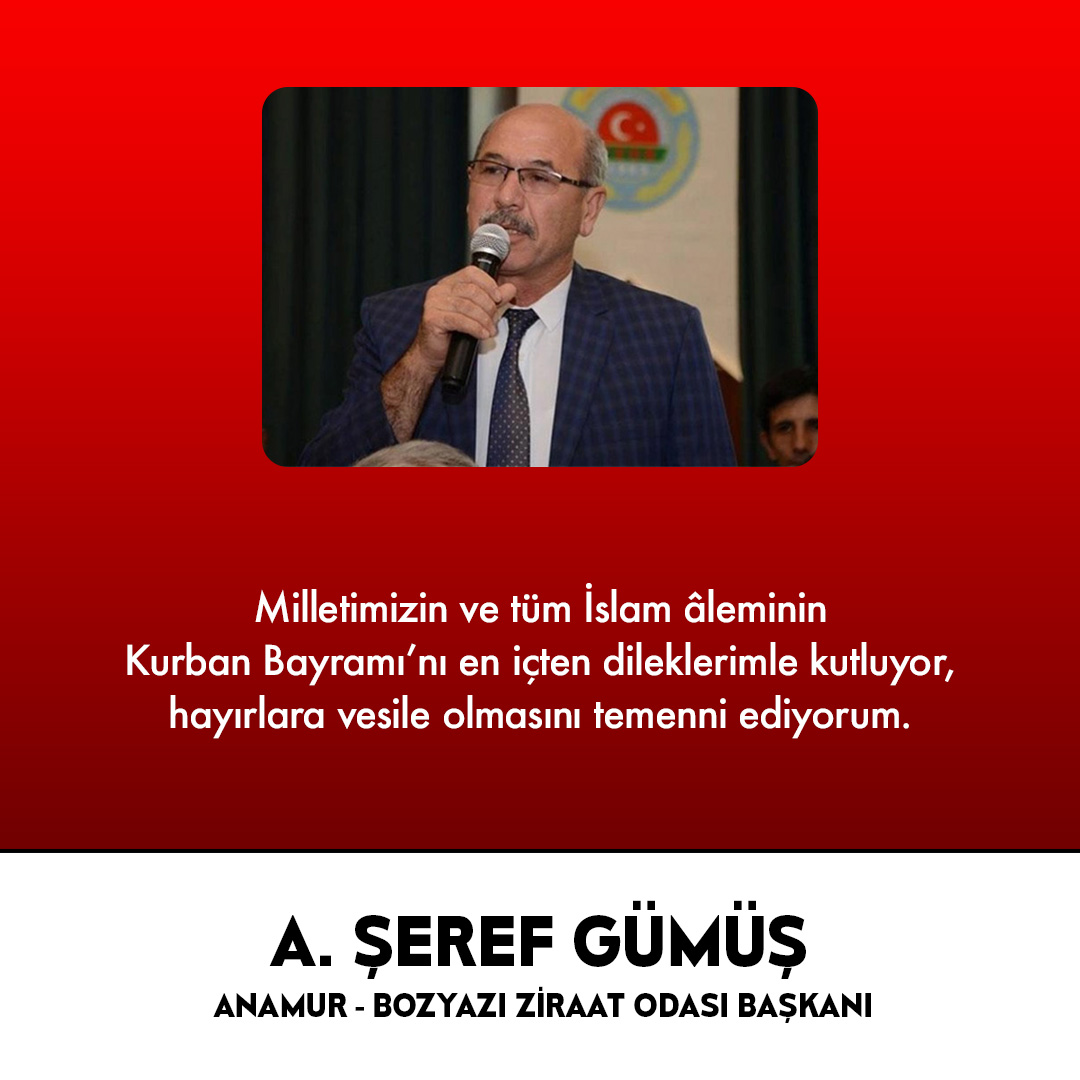 ANAMUR GAZETESİ / Musa Suğan - Anamur - Bozyazı Ziraat Odası Başkanı A. Şeref Gümüş, Kurban Bayramı dolayısıyla bir mesaj yayımladı.