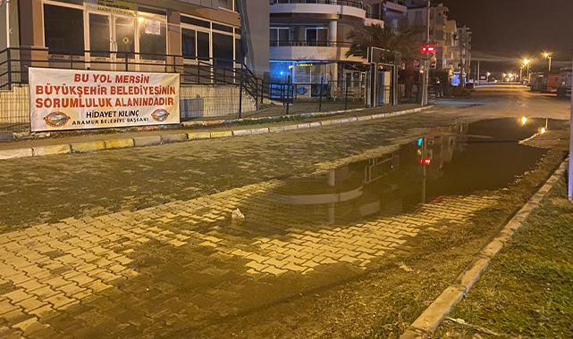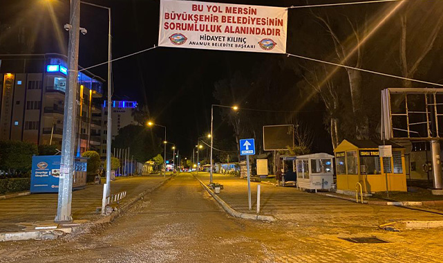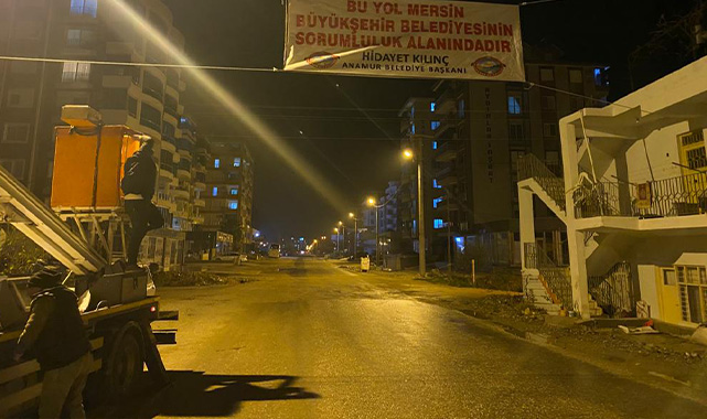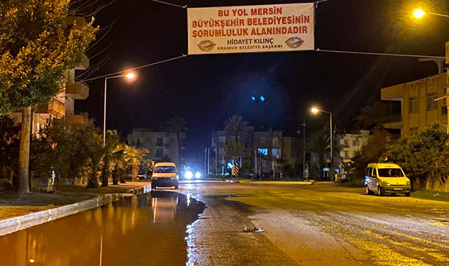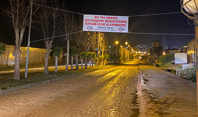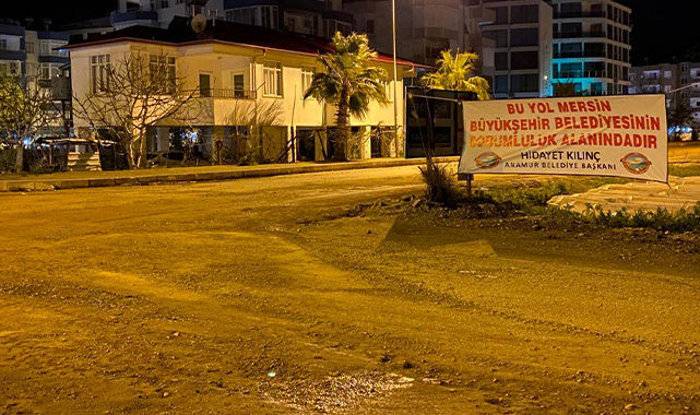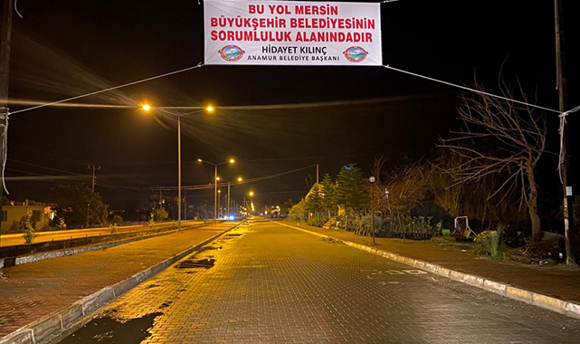Anamur Belediye Başkanı Hidayet Kılınç, Mersin Büyükşehir Belediyesi'nin sorumluluk alanında bulunan yollardan çok fazla şikayet gelmesi üzerine bozuk yollara 'bu yol Mersin Büyükşehir Belediyesi'nin sorumluluk alanındadır' pankartı asarak hatırlatmada bulundu.