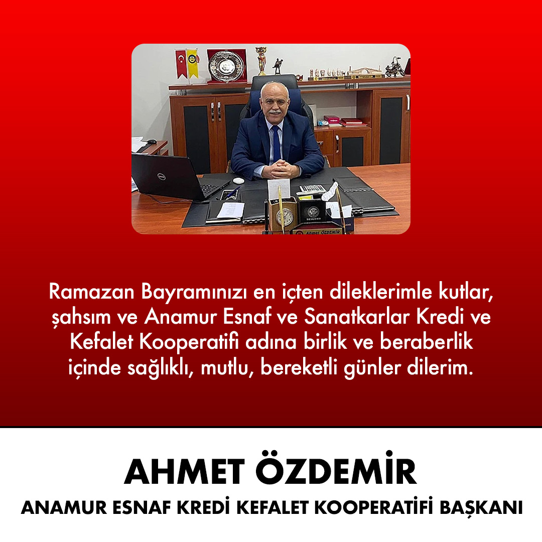 ANAMUR GAZETESİ / Musa Suğan - Anamur Esnaf ve Sanatkarlar Kredi ve Kefalet Kooperatifi Başkanı Ahmet Özdemir, Ramazan Bayramı dolayısıyla bir mesaj yayımladı.