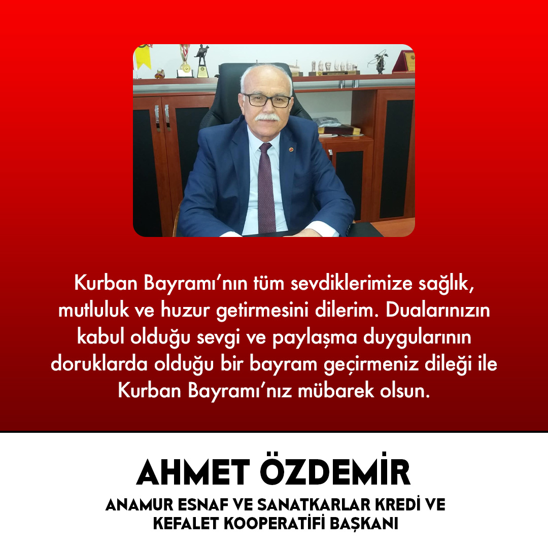 ANAMUR GAZETESİ / Musa Suğan - Anamur Esnaf ve Sanatkarlar Kredi ve Kefalet Kooperatifi Başkanı Ahmet Özdemir, Kurban Bayramı dolayısıyla bir mesaj yayımladı.