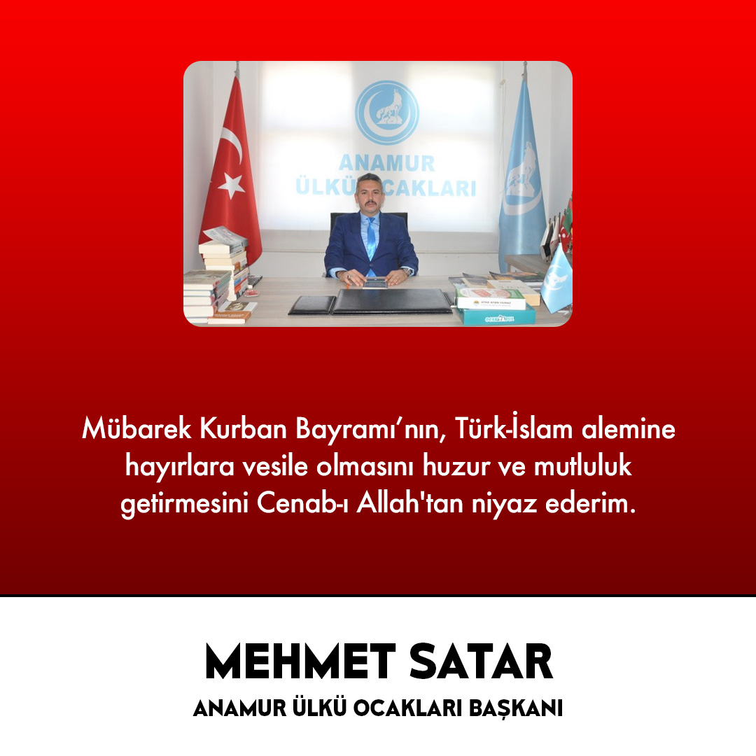 ANAMUR GAZETESİ / Musa Suğan - Anamur Ülkü Ocakları Başkanı Mehmet Satar, Kurban Bayramı için, kutlama mesajı yayınladı.
