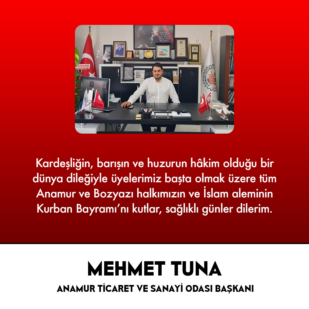 ANAMUR GAZETESİ / Musa Suğan - Anamur Ticaret ve Sanayi Odası Başkanı Mehmet Tuna, Kurban Bayramı dolayısıyla bir mesaj yayımladı.