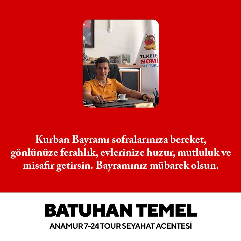 ANAMUR GAZETESİ / Musa Suğan - Anamur 7-24 Tour Seyahat Acentesi Sahibi Batuhan Temel, Kurban Bayramı dolayısıyla bir mesaj yayımladı.