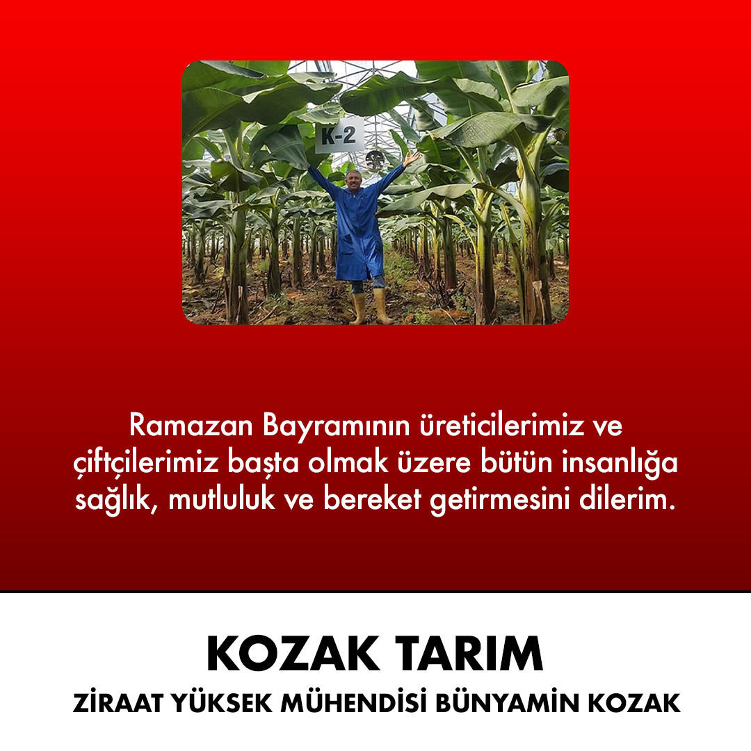 Muz Uzmanı Kozak, Ramazan Bayramı için, mesajında şunları kaydetti:Ramazan Bayramının üreticilerimiz ve çiftçilerimiz başta olmak üzere bütün insanlığa sağlık, mutluluk ve bereket getirmesini dilerim.Kozak Tarım İletişimEmniyet Müdürlüğü Karşısı Taşkın Apt. Altı, 0532 486 2853