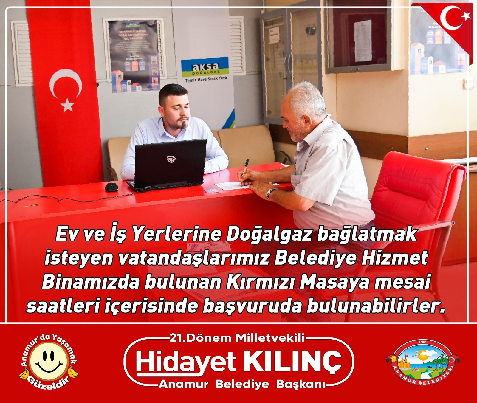 Anamur Belediyesi’nin girişimleri ile ilçeye getirilecek olan Doğalgaz için abonelik işlemleri başladı.Aksa Doğalgaz Firması tarafından şehir içi dağıtım şebekesinin döşenmeye başlaması ile birlikte ev ve işyerlerine doğalgaz bağlatmak isteyen vatandaşlar için başvurular alınmaya başladı.Anamur Belediyesi Hizmet Binası içerisinde bulunan kırmızı masada hazırlanan başvuru toplama noktasında Aksa Doğalgaz yetkilileri tarafından vatandaşlara doğalgazın kolaylıkları anlatılırken aynı zamanda başvurularda kabul edilmeye başladı.Anamur Belediye Başkanı Hidayet Kılınç tarafından yapılan açıklamada ev ve işyerlerine doğalgaz bağlatmak yada doğalgaz konusunda bilgi almak isteyen vatandaşların mesai saatleri içerisinde Kırmızı Masa’ya gelerek başvuru yapabileceklerini belirtildi.