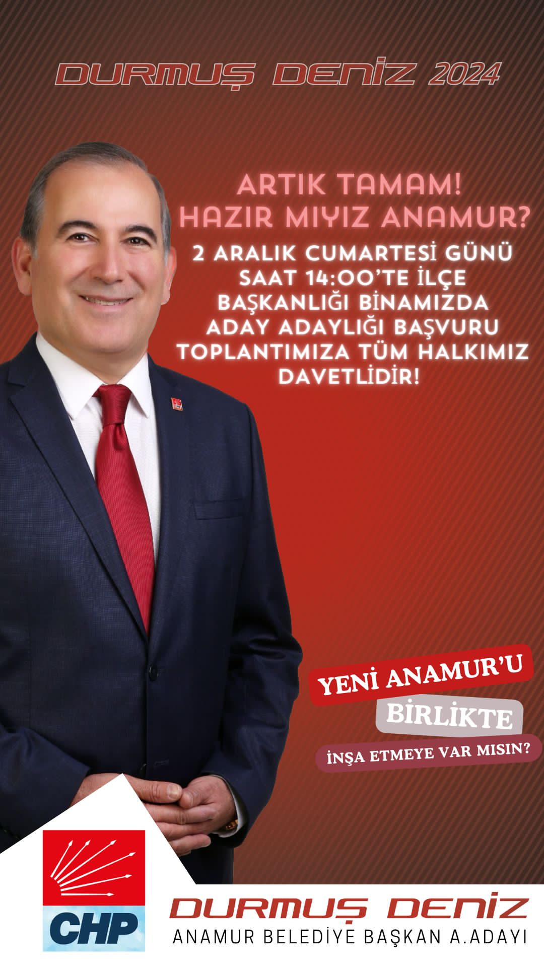 ANAMUR GAZETESİ / Musa Suğan - Anamur Belediye Başkan Aday Adayı Durmuş Deniz, yarın CHP İlçe binasında aday adaylığını açıklayacak.