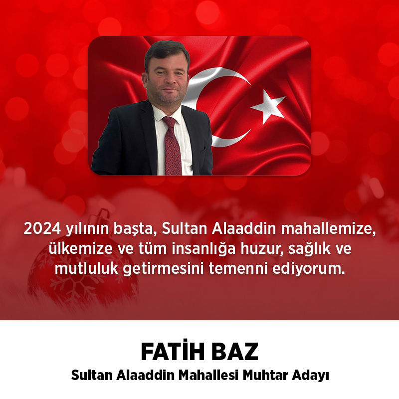 Muhtar Adayı Fatih Baz, 2024 yılı için, mesajında şunları kaydetti:2024 yılının başta, Sultan Alaaddin mahallemize, ülkemize ve tüm insanlığa huzur, sağlık ve mutluluk getirmesini temenni ediyorum.Fatih Baz İletişim, 0533 312 82 08