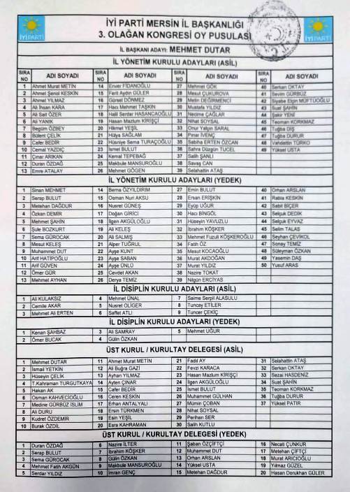 ANAMUR GAZETESİ / Musa Suğan - İyi Parti Mersin İl Başkanlığı’na tekrar seçilen Mehmet Dutar, yeni oluşturduğu kurultay delegeleri listesine Osman Kahvecioğlu ve Salih Kutlu'yu da aldı.