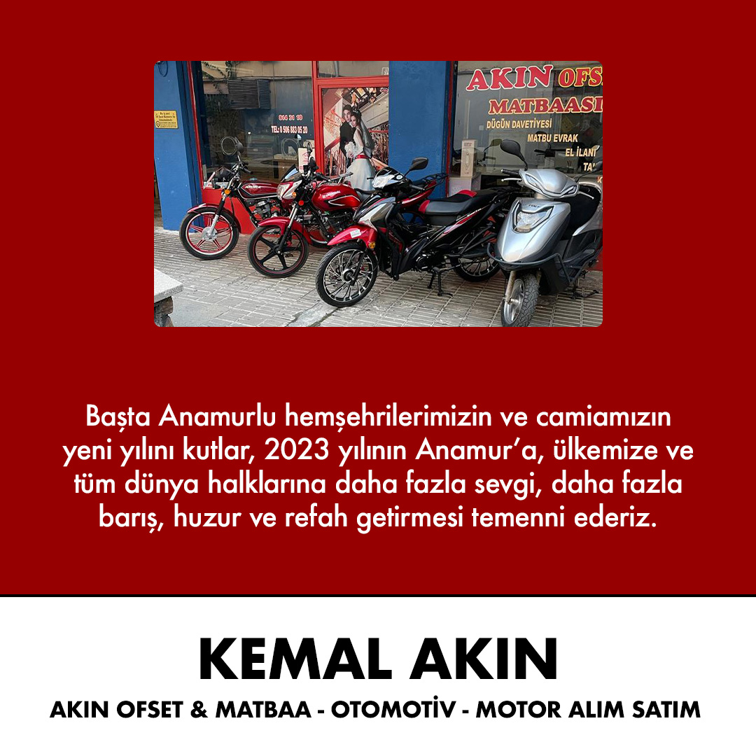 ANAMUR GAZETESİ / Musa Suğan - Akın Ofset & Matbaa - Otomotiv & Motor Alım Satım İşletme Sahibi Kemal Akın, 2023 yılı için, yeni yıl mesajı yayınladı.
