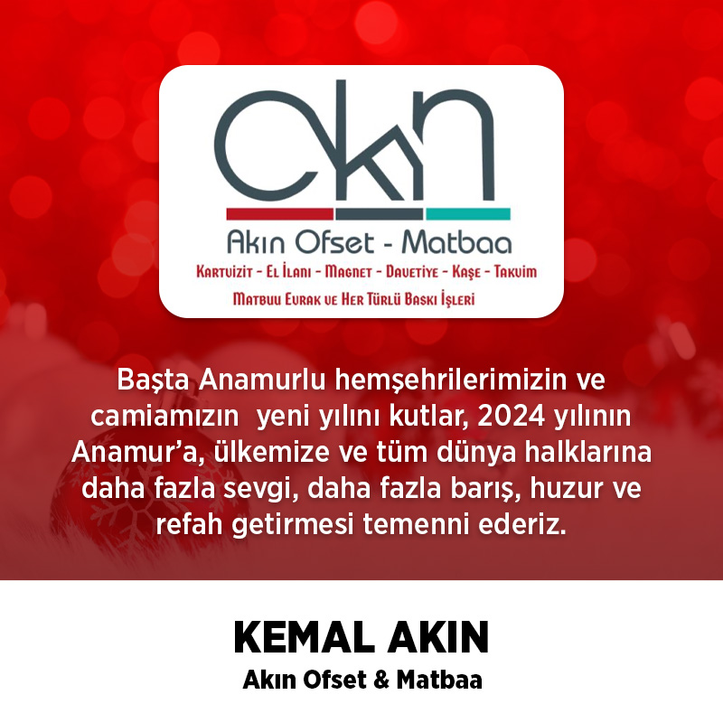 Akın, 2024 yılı için, mesajında şunları kaydetti:Başta Anamurlu hemşehrilerimizin ve camiamızın yeni yılını kutlar, 2024 yılının Anamur’a, ülkemize ve tüm dünya halklarına daha fazla sevgi, daha fazla barış, huzur ve refah getirmesi temenni ederiz.Akın Ofset & Matbaa İletişimSaray Mah. Bankalar Cad. 5 Anamur, Mersin, 0506 883 05 20