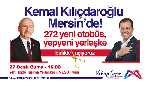 Cumhuriyet Halk Partisi (CHP) Genel Başkanı Kemal Kılıçdaroğlu, 27 Ocak'ta Mersin'e geliyor.Cumhuriyet Halk Partisi (CHP) Genel Başkanı Kemal Kılıçdaroğlu, Mersin Büyükşehir Belediyesi tarafından düzenlenecek yeni toplu taşıma yerleşkesinin açılışına katılacak.Açılışı, CHP Lideri Kılıçdaroğlu ve Mersin Büyükşehir Belediye Başkanı Vahap Seçer birlikte yapacak.