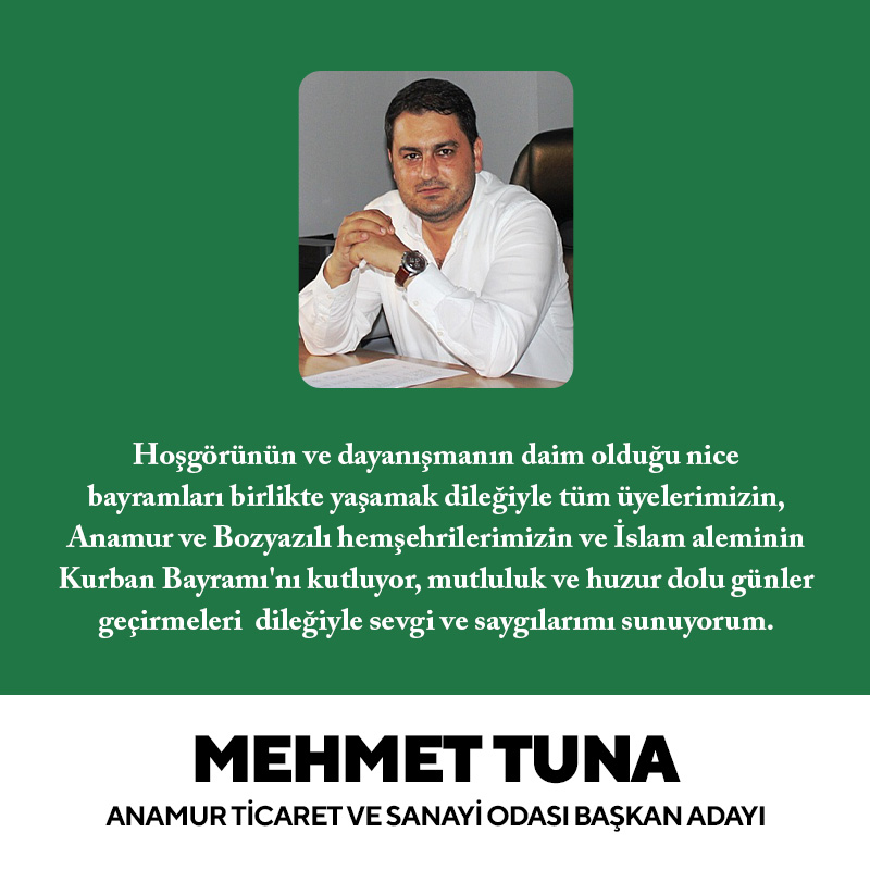 ANAMUR GAZETESİ / Musa Suğan - Anamur Ticaret ve Sanayi Odası Başkan Adayı Mehmet Tuna, Kurban Bayramı dolayısıyla bir mesaj yayımladı.