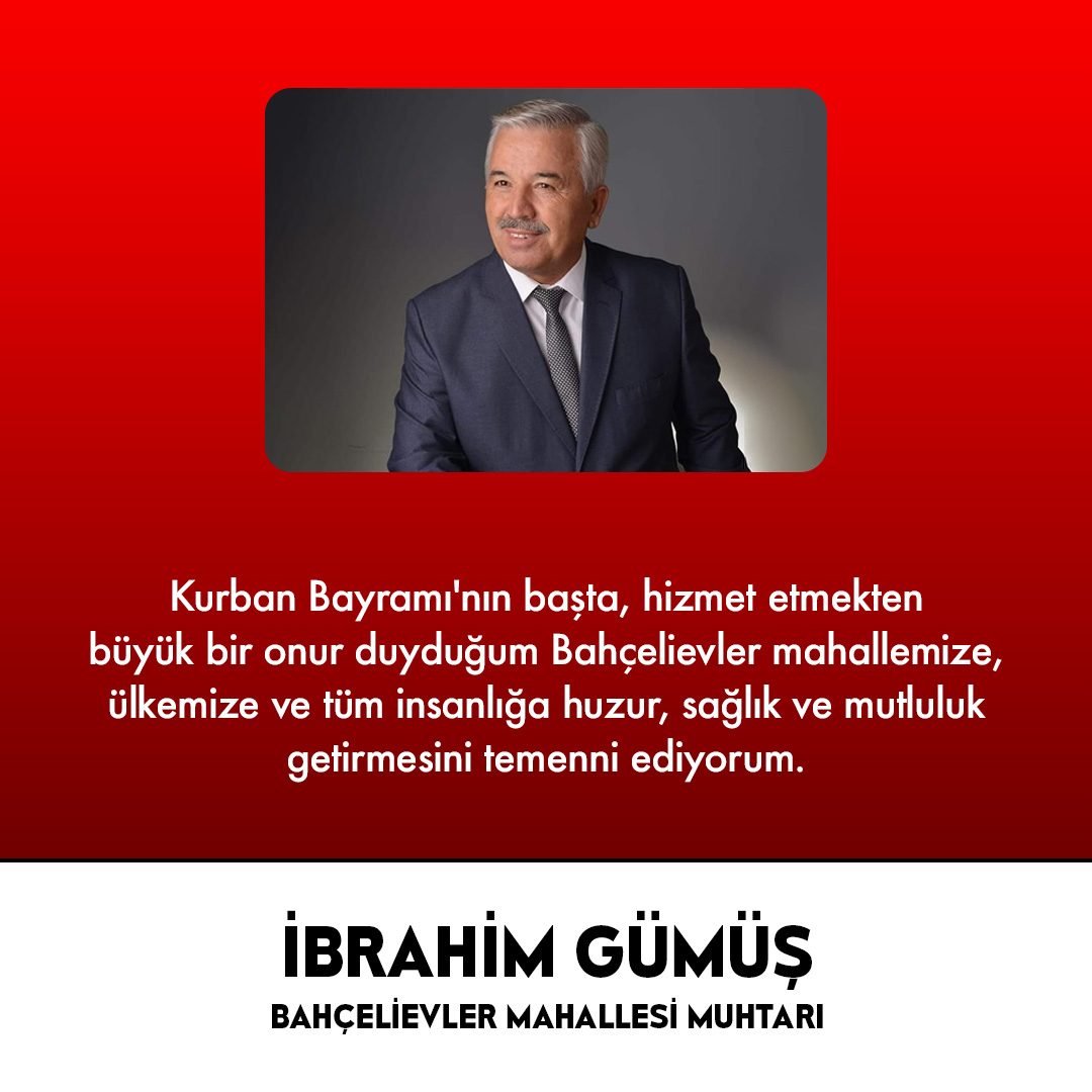 Muhtar İbrahim Gümüş, Kurban Bayramı için, mesajında şunları kaydetti:Kurban Bayramı'nın başta, hizmet etmekten büyük bir onur duyduğum Bahçelievler mahallemize, ülkemize ve tüm insanlığa huzur, sağlık ve mutluluk getirmesini temenni ediyorum.