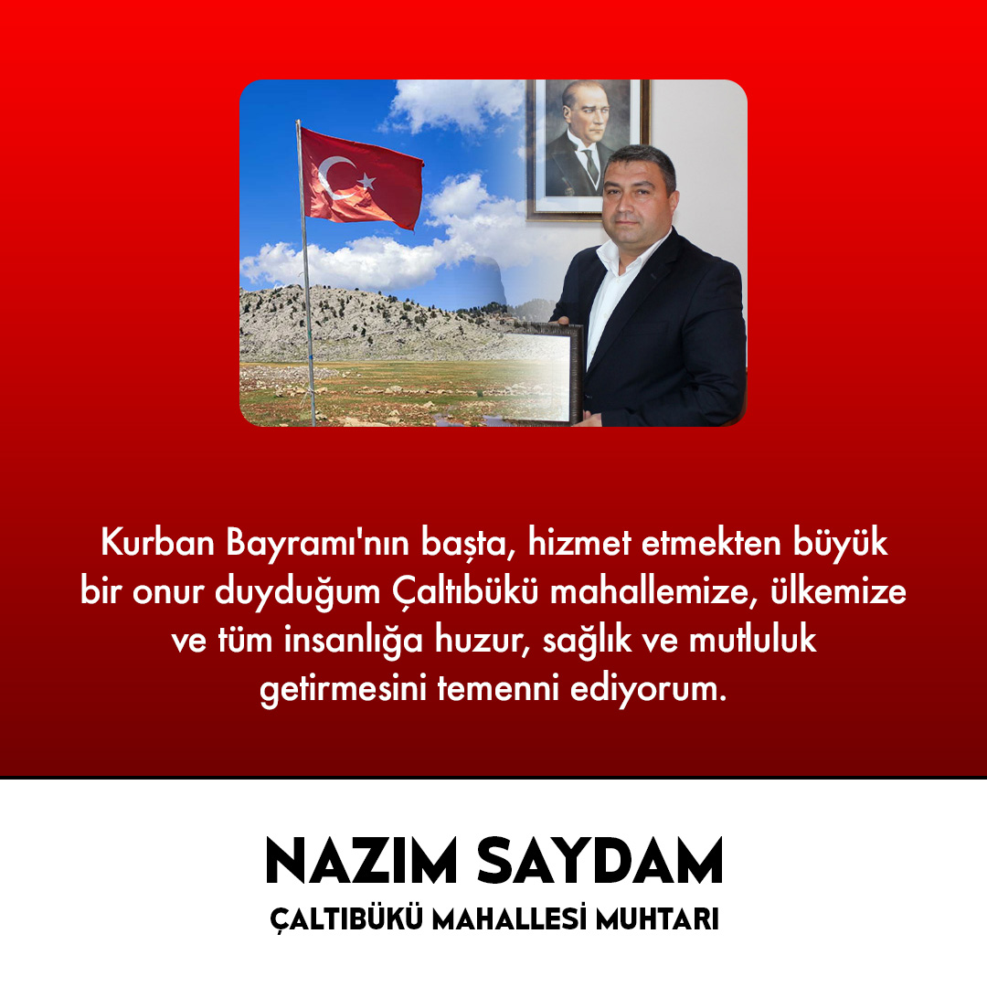 Muhtar Nazım Saydam, Kurban Bayramı için, mesajında şunları kaydetti:Kurban Bayramı'nın başta, hizmet etmekten büyük bir onur duyduğum Çaltıbükü mahallemize, ülkemize ve tüm insanlığa huzur, sağlık ve mutluluk getirmesini temenni ediyorum.