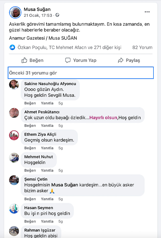 Anamur Gazetesi İmtiyaz Sahibi Musa Suğan, bedelli askerliğini yapmak için Ankara'ya gitmişti. Bedelli askerlik görevi için 23 Aralık'ta Ankara Mamak'taki birliğine teslim olan Musa Suğan askerliğini tamamladı.