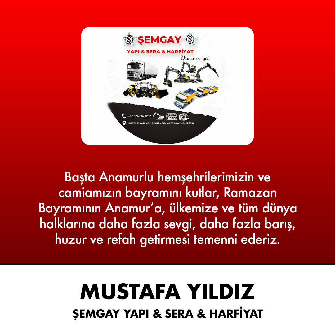ANAMUR GAZETESİ / Musa Suğan - Şemgay Yapı Sera & Harfiyat Sahibi Mustafa Yıldız, Ramazan Bayramı için, kutlama mesajı yayınladı.