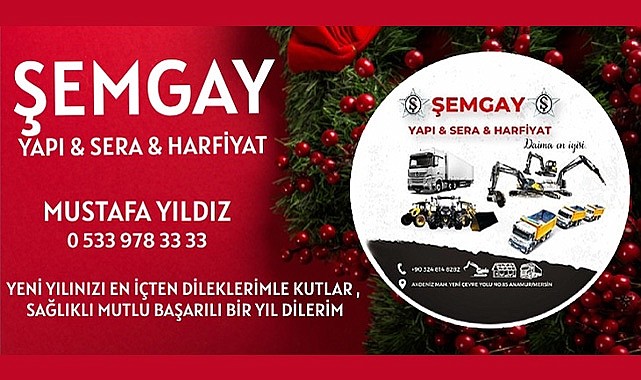 İş insanı Mustafa Yıldız, 2024 yılı için, mesajında şunları kaydetti:Başta Anamurlu hemşehrilerimizin ve camiamızın yeni yılını kutlar, 2024 yılının Anamur’a, ülkemize ve tüm dünya halklarına daha fazla sevgi, daha fazla barış, huzur ve refah getirmesi temenni ederiz.Şemgay Sera & Harfiyat & Nakliyat İletişimAkdeniz Mah. Yeni Çevre Yolu No: 85, 0533 978 33 33