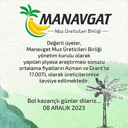 ANAMUR GAZETESİ / Musa Suğan - Manavgat Muz Üreticileri Birliği'nin, 8 Aralık tarihli itibariyle tavsiye muz fiyatı 17,00 TL oldu.