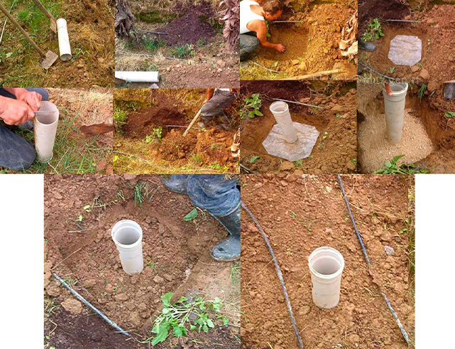İki bitki arasındaki bölgeye, iki damlama hortumunun, ikişerden dört memesini üzerinde tutacak şekilde, 50*50 cm. boyutlarında ve toprak yapısına göre 40-50 cm. derinlikte bir çukur açılır. Çukur tabanına plastik bir örtü serilir. Örtü üzerine 60 cm. uzunlukta, 10-15 cm. çapında, alt yüzeyi tırtıklı, plastik bir boru, taban yüzeyin ortasına gelecek şekilde yerleştirilir.