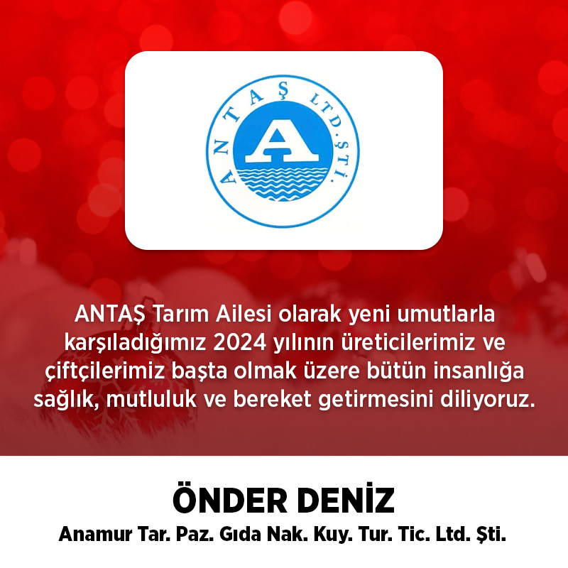 İş insanı Önder Deniz, 2024 yılı için, mesajında şunları kaydetti:ANTAŞ Ailesi olarak yeni umutlarla karşıladığımız 2024 yılının üreticilerimiz ve çiftçilerimiz başta olmak üzere bütün insanlığa sağlık, mutluluk ve bereket getirmesini diliyoruz.