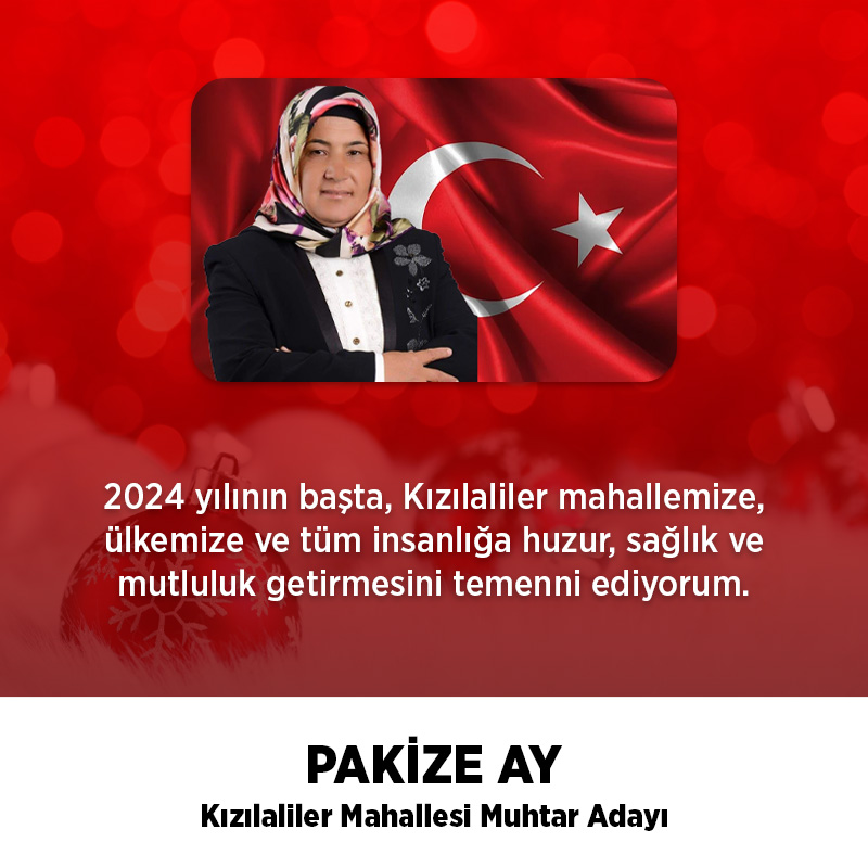 Muhtar Adayı Pakize Ay, 2024 yılı için, mesajında şunları kaydetti:2024 yılının başta, Kızılaliler mahallemize, ülkemize ve tüm insanlığa huzur, sağlık ve mutluluk getirmesini temenni ediyorum.