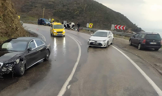 Yerlerin ıslak ve kaygan olması nedeniyle meydana gelen kazada, araç takla atınca hurdaya döndü.