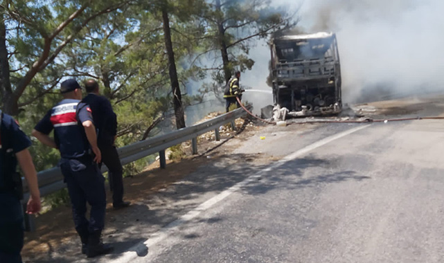 Plakası ve sürücüsünün adı öğrenilemeyen şehirler arası yolcu otobüsünde, henüz belirlenemeyen nedenle yangın çıktı. İçerisindeki 24 yolcu otobüsten indirilirken, araçtaki alevler rüzgarın da etkisiyle ormanlık alana sıçradı.
