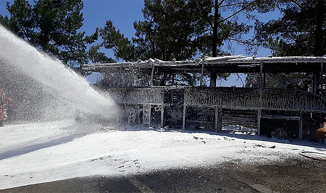 İtfaiye ekiplerinin de destek verdiği çalışmalarla yangın kontrol altına alınarak söndürüldü, yolcu otobüsü ise kullanılamaz hale geldi.
