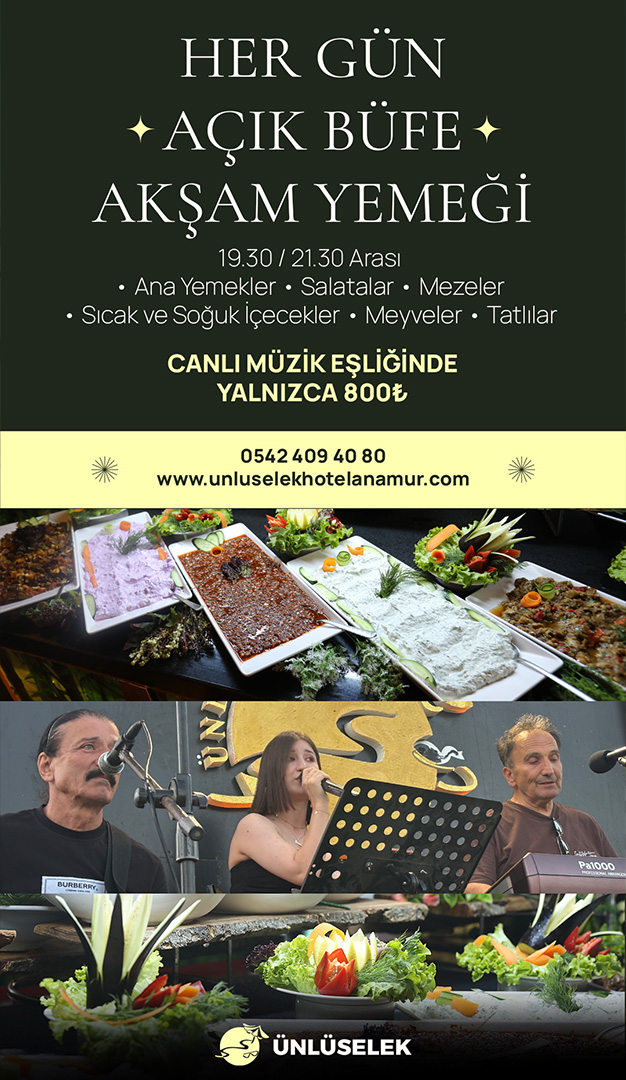 Anamur’un köklü konaklama ve etkinlik merkezlerinden Ünlüselek Otel, yaz sezonuna özel kampanyasıyla dikkat çekiyor. Otel, 15 Eylül’e kadar her akşam 19.30 ile 21.30 saatleri arasında düzenlediği Açık Büfe akşam yemeği ve Canlı Müzik programıyla misafirlerini ağırlamaya devam edecek.Kampanya kapsamında açık büfe menüsünde et, tavuk, balık, sulu et yemekleri, sebze yemekleri, garnitürlü makarna, pilav ve çorba gibi sıcak ana yemeklerin yanı sıra; 7-8 çeşit meze, 6-7 çeşit salata ve turşu, taze yeşillikler, 3-4 çeşit ev yapımı tatlı, 3-4 çeşit mevsim meyvesi, özel ekmek türleri, çeşitli salata sosları, yaklaşık sekiz farklı kahve türü ve dört çeşit meyve suyu yer alıyor. Bu zengin menünün kişi başı fiyatı ise 800 TL olarak belirlendi.Her Akşam Farklı Sanatçılar Sahne AlıyorÜnlüselek Otel’de sadece Yemek değil, müzik de dolu dolu yaşanıyor. Haftanın her günü canlı müzik eşliğinde gerçekleştirilen akşam programlarında birbirinden değerli sanatçılar sahne alıyor. Program şöyle:Pazartesi: Ahmet Demir Orkestrası